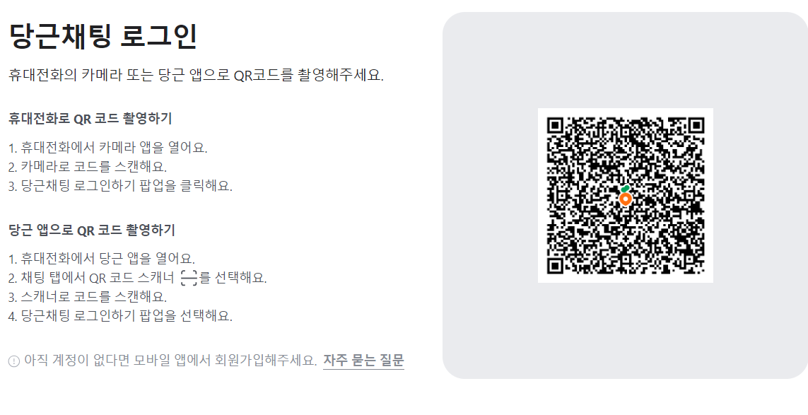 - ‘채팅하기’ 버튼을 클릭하면 QR코드가 표시된 화면이 나타납니다. 이 QR코드를 당근마켓앱을 사용하는 본인의 핸드폰 카메라로 촬영하여 로그인할 수 있습니다.