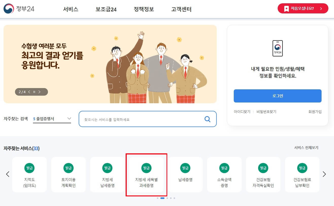 먼저, 정부24 홈페이지에 접속합니다. 검색창에 '지방세 세목별 과세증명서'를 입력하고 검색합니다.