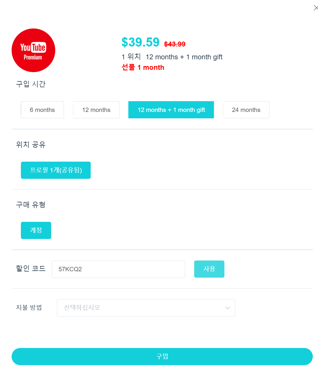 • 원하는 구독 플랜을 선택하고 할인 코드를 입력합니다.
