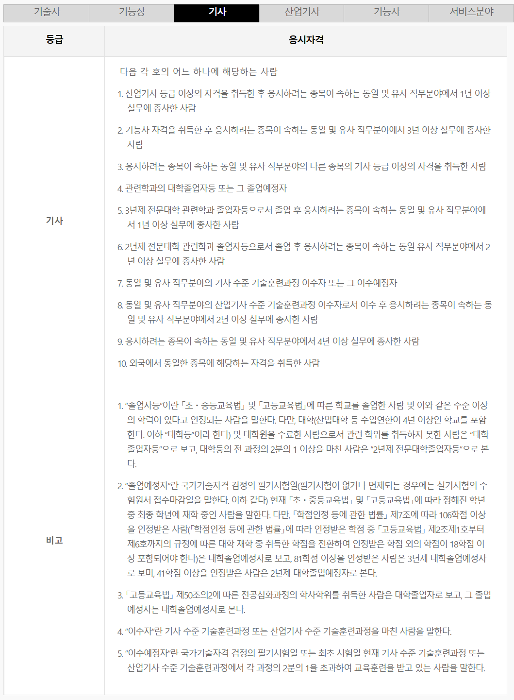 - 동일 및 유사 직무분야의 기사 수준 기술훈련과정 이수자 또는 이수예정자