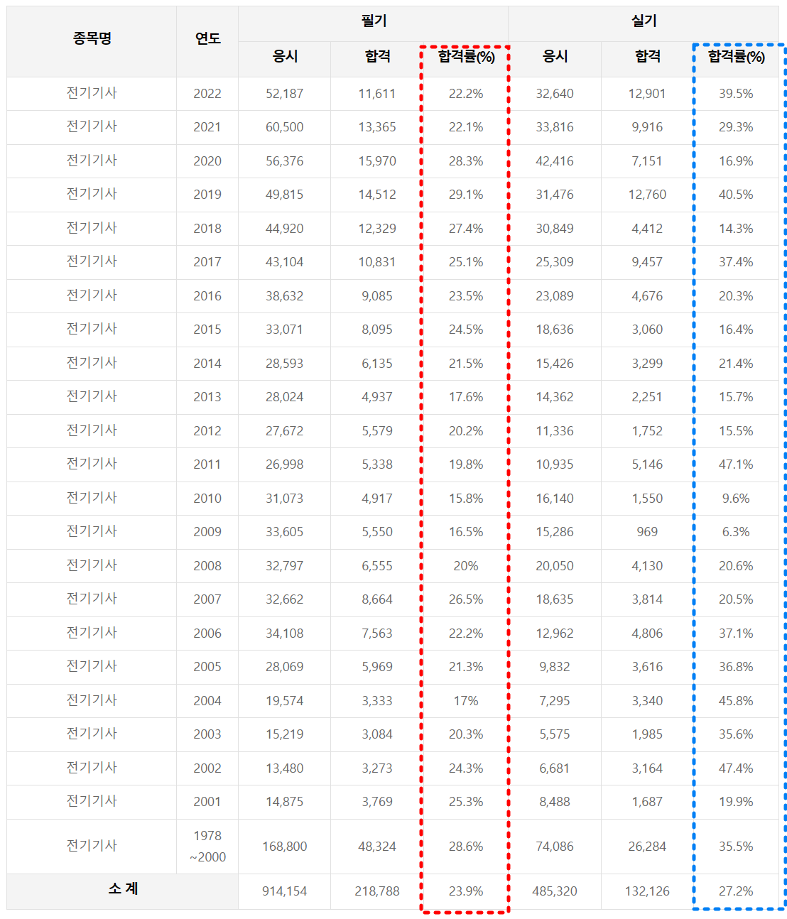 전기기사 시험의 합격률은 필기시험과 실기시험에 따라 다릅니다.