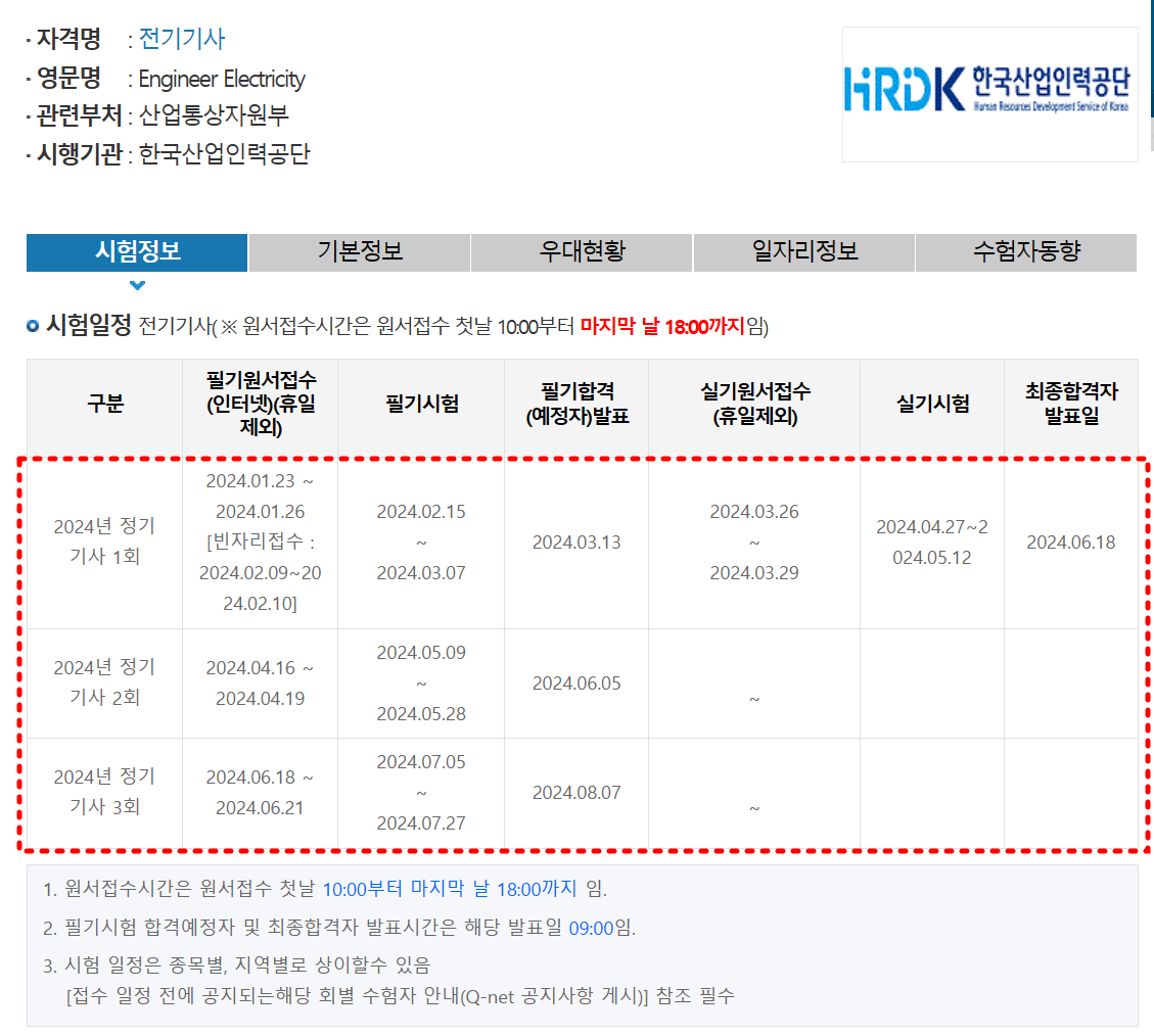 2024년 전기기사 시험은 총 세 번 시행됩니다. 필기시험과 실기시험으로 나누어지며, 각 회차별 일정은 다음과 같습니다: