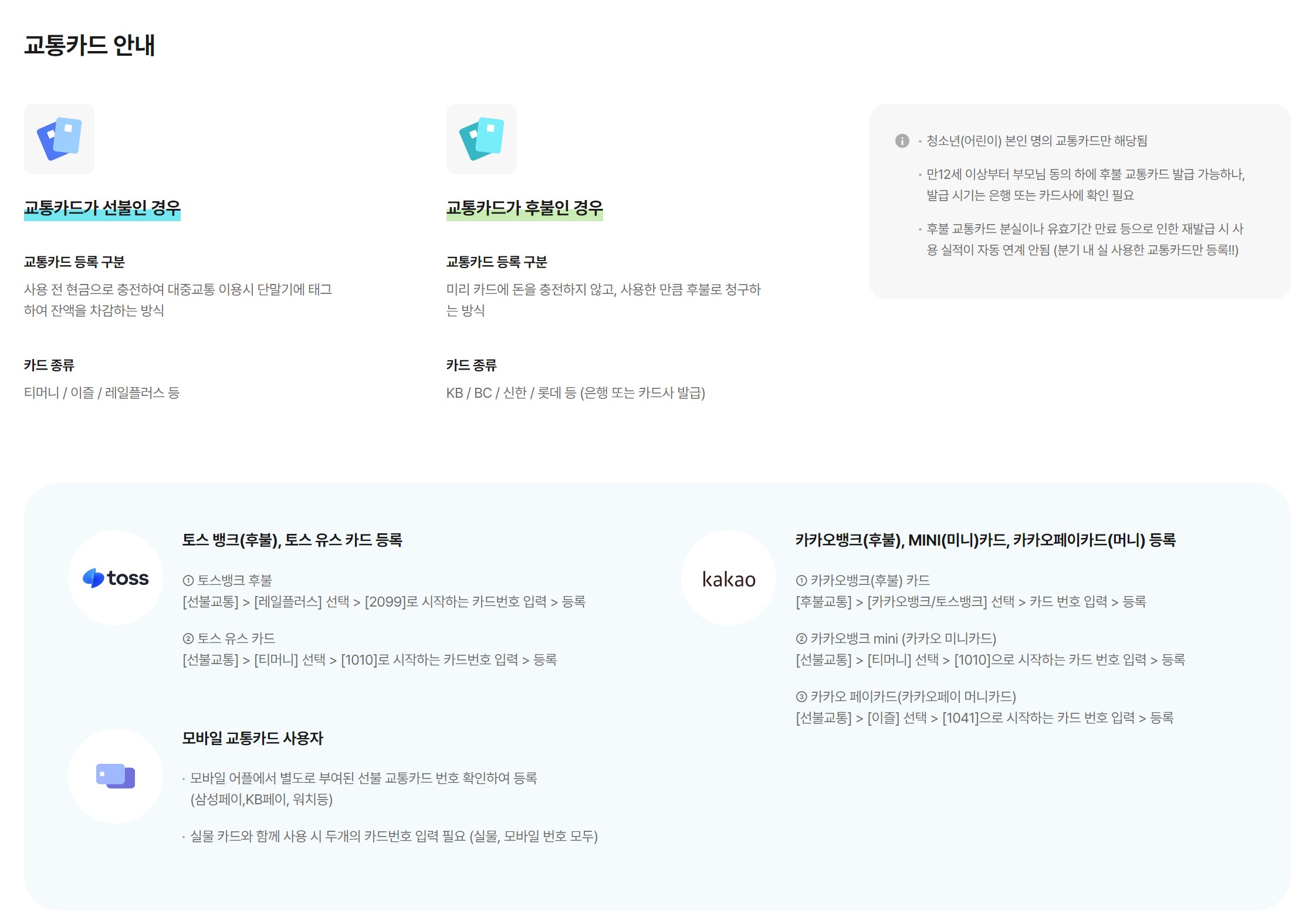 - 교통카드 등록: 실제 사용할 교통카드(어린이청소년 본인)와 분실 또는 교체할 카드를 최대 2장 등록할 수 있습니다.