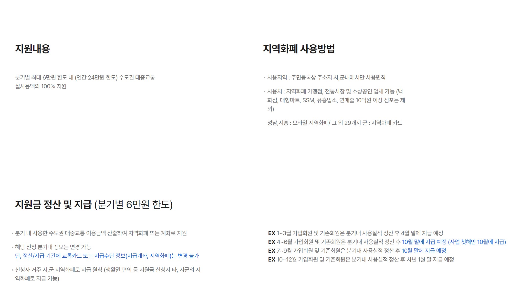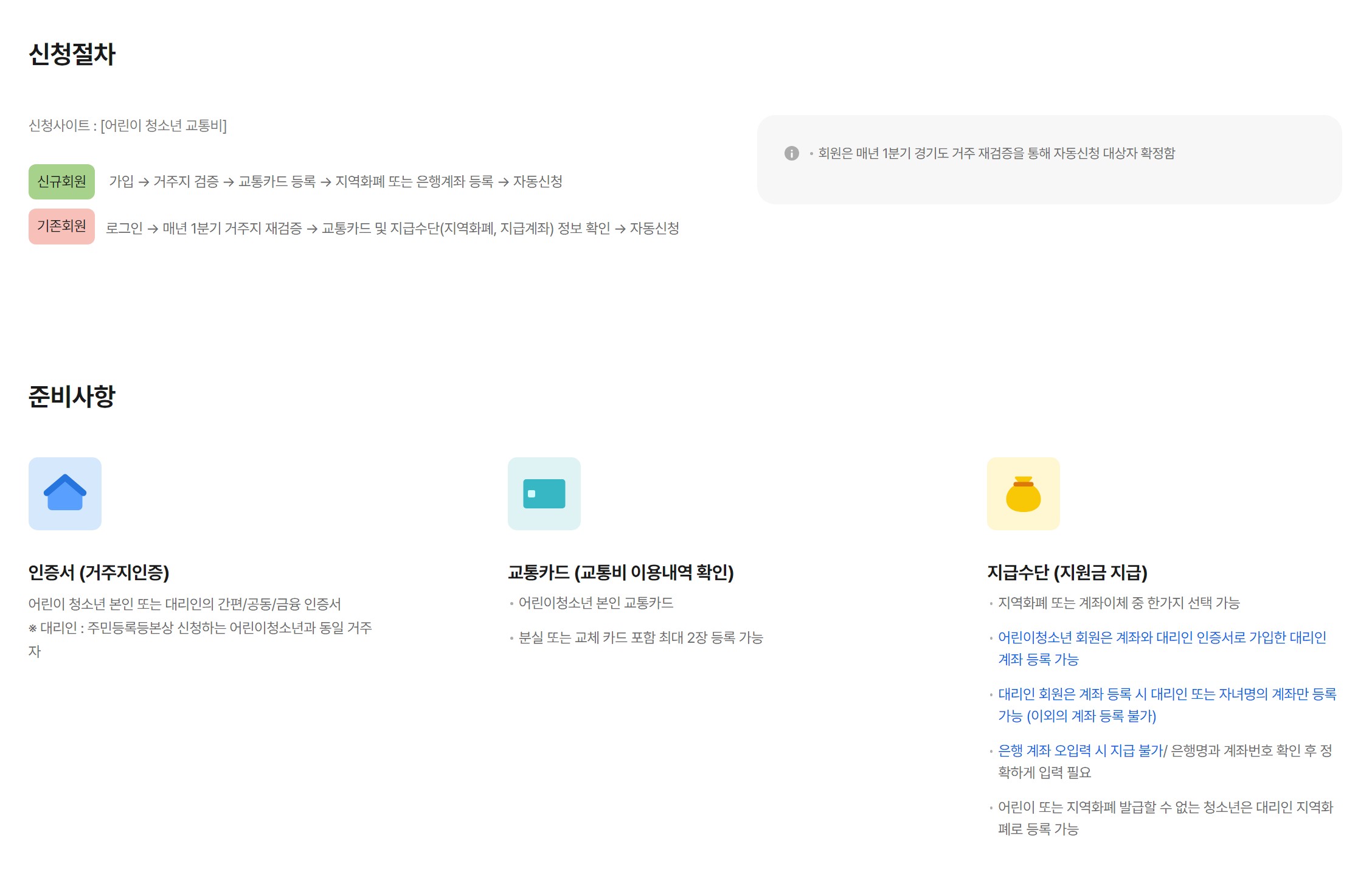 - 회원가입 및 검증: 신규 회원은 회원가입, 거주지 검증, 교통카드 등록, 지역화폐/은행 계좌 등록을 하면 자동으로 신청됩니다. 기존 회원은 로그인 후 매년 1분기 거주지 재검증, 교통카드나 지급 수단 선택을 하면 자동 신청됩니다.