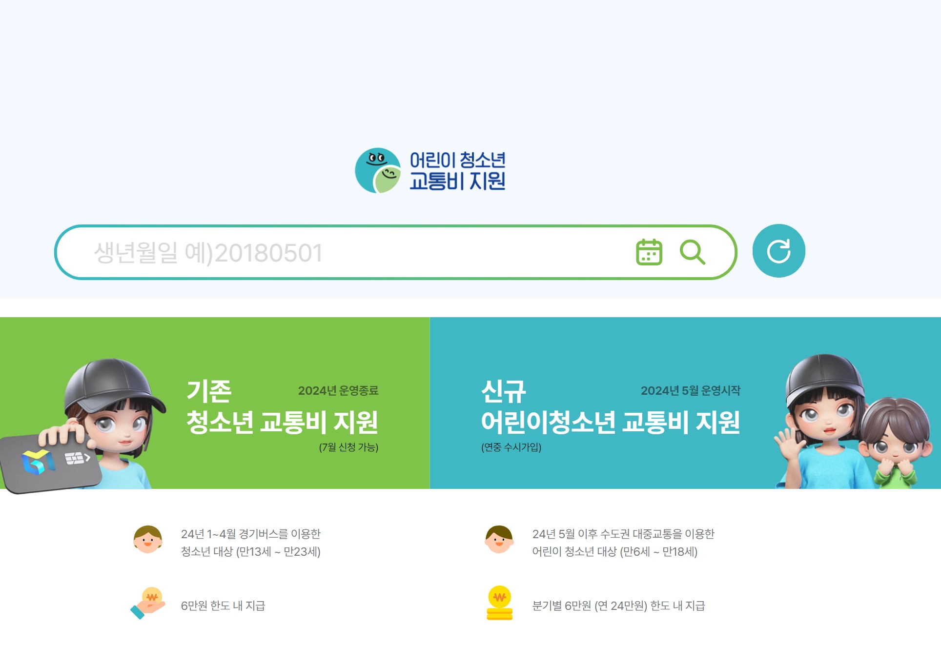 - 온라인 검색: '어린이 청소년 교통비'를 검색하면 홈페이지가 나옵니다. 해당 사이트에 접속하세요.