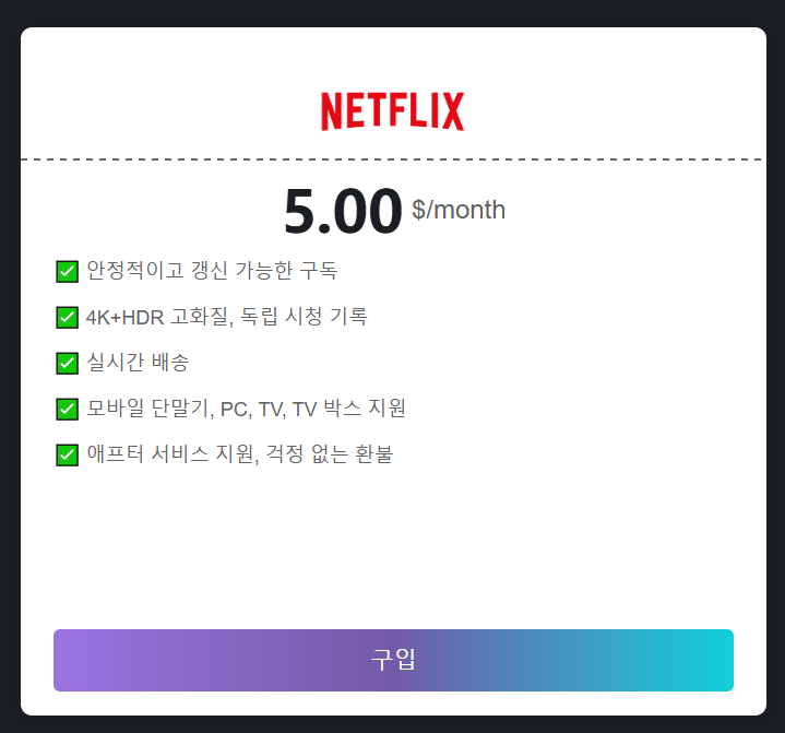 저는 현재 월 $5.00의 요금으로 4K 고화질 넷플릭스를 마음껏 즐기고 있습니다. 기존 넷플릭스 요금제를 생각하면 상당히 큰 금액을 절약한 셈입니다.