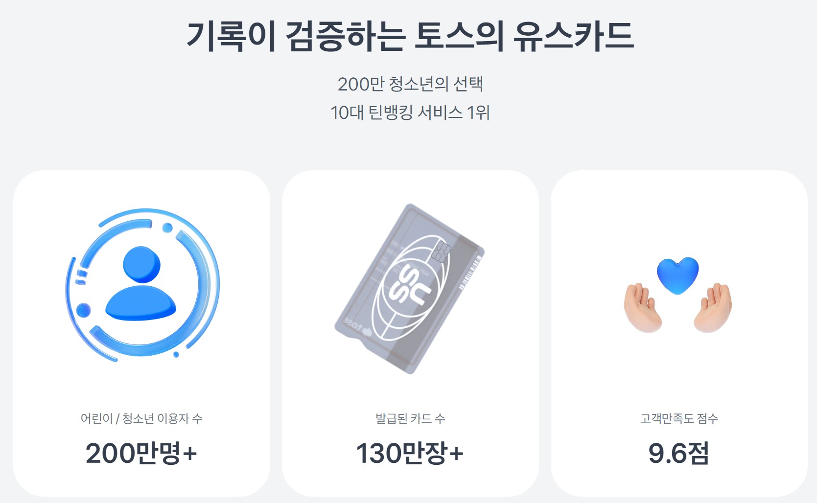 - 카드를 수령한 후 토스 앱 → [토스유스카드]에서 등록하여 사용을 시작할 수 있습니다.